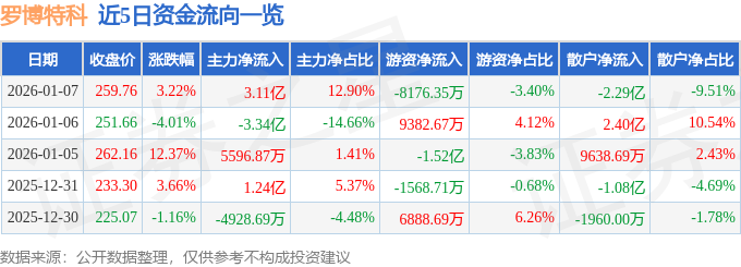 证券之星消息,截至2026年1月7日收盘,罗博特科(300757)报收于259.76元,上涨3.22%,换手率6.12%,成交量9.21万手,成交额24.08亿元。