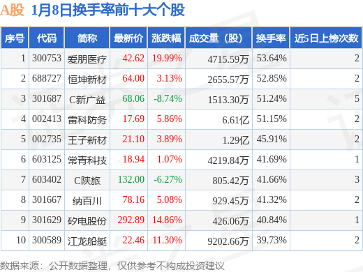 当日A股换手率前10大个股中8只个股收涨,平均涨幅8.15%,其中爱朋医疗(300753)以换手率53.64%排第一,8只个股近5个交易日中多次上榜。