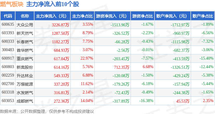 从资金流向上来看,当日燃气板块主力资金净流出2.6亿元,游资资金净流入4931.14万元,散户资金净流入2.11亿元。燃气板块个股资金流向见下表: