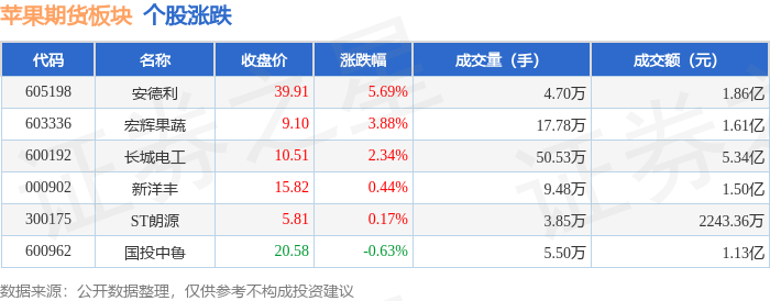 证券之星消息,1月8日苹果期货板块较上一交易日上涨2.04%,安德利领涨。当日上证指数报收于4082.98,下跌0.07%。深证成指报收于13959.48,下跌0.51%。苹果期货板块个股涨跌见下表: