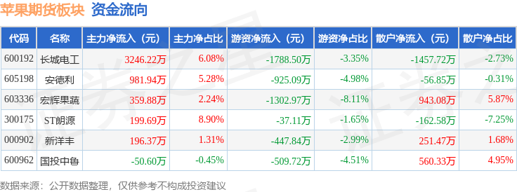 从资金流向上来看,当日苹果期货板块主力资金净流入4933.51万元,游资资金净流出5011.23万元,散户资金净流入77.72万元。苹果期货板块个股资金流向见下表: