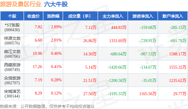 个股表现方面,旅游及景区行业当日领涨股为*ST张股(000430),该股当日报收7.82,上涨2.89%,成交量7.12万,主力资金净流入444.83万元。祥源文旅(600576)以上涨2.01%紧随其后,该股当日成交量26.86万,主力资金净流入1331.69万元。除此之外,曲江文旅(600706)、西藏旅游(600749)、众信旅游(002707)均进入当日牛股之列。具体个股列表见下表: