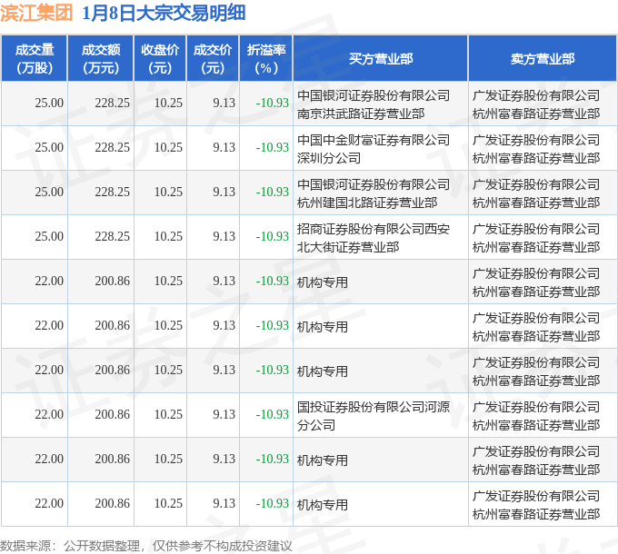 证券之星消息,1月8日滨江集团发生大宗交易,交易数据如下: