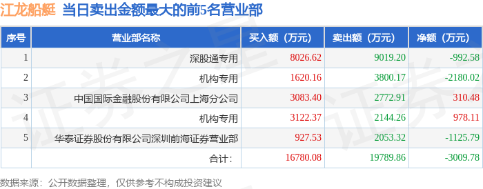 证券之星消息,沪深交易所2026年1月8日公布的交易公开信息显示,江龙船艇(300589)因日换手率达到30%的前5只证券登上龙虎榜。此次是近5个交易日内第2次上榜。