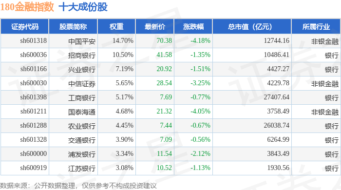 证券之星消息,1月8日,180金融(000018)指数报收于5966.38点,跌1.98%,成交691.87亿元,换手率0.32%。当日该指数成份股中,上涨的有3家,渝农商行以1.72%的涨幅领涨,下跌的有40家,华泰证券以5.04%的跌幅领跌。