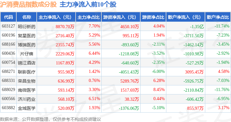 资金流向方面,沪消费品(000103)指数成份股当日主力资金净流出合计16.42亿元,游资资金净流入合计11.61亿元,散户资金净流入合计4.81亿元。成份股资金流向详情见下表: