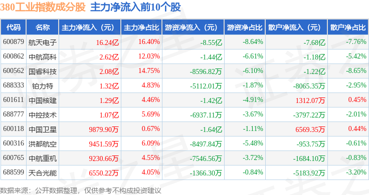资金流向方面,380工业(000106)指数成份股当日主力资金净流入合计1.4亿元,游资资金净流出合计6.28亿元,散户资金净流入合计4.88亿元。成份股资金流向详情见下表: