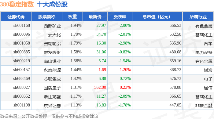 380稳定(000142)指数十大成份股详情如下: