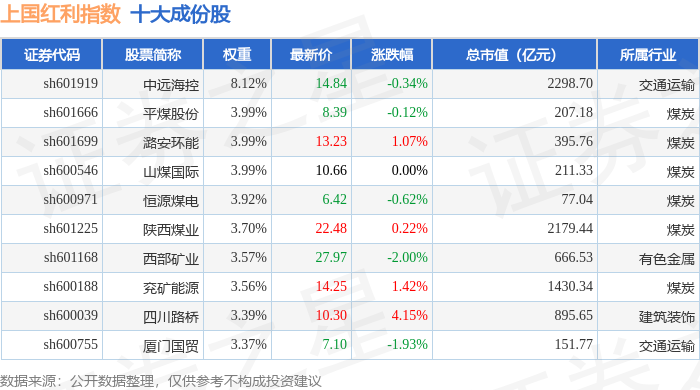证券之星消息,1月8日,上国红利(000151)指数报收于1555.85点,跌0.14%,成交210.13亿元,换手率0.33%。当日该指数成份股中,上涨的有9家,四川路桥以4.15%的涨幅领涨,下跌的有20家,西部矿业以2.0%的跌幅领跌。