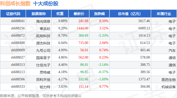 证券之星消息,1月8日,科创成长(000690)指数报收于1998.12点,涨1.58%,成交687.59亿元,换手率3.05%。当日该指数成份股中,上涨的有31家,航天南湖以20.0%的涨幅领涨,下跌的有19家,拓荆科技以5.33%的跌幅领跌。