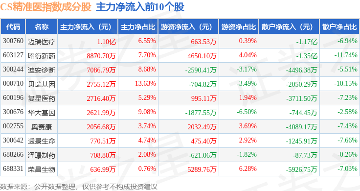 资金流向方面,CS精准医(000863)指数成份股当日主力资金净流出合计2.5亿元,游资资金净流入合计2.9亿元,散户资金净流出合计3969.75万元。成份股资金流向详情见下表: