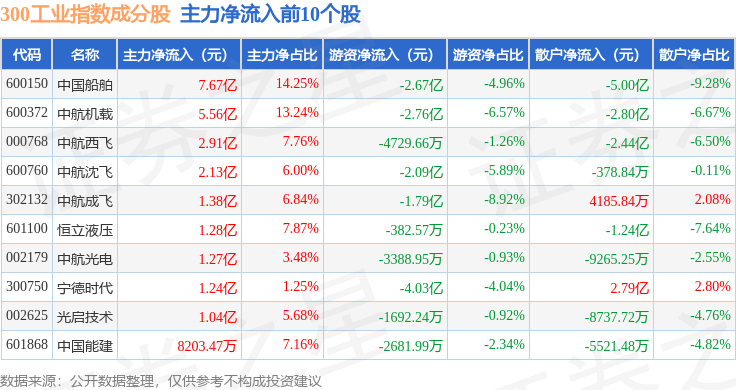 资金流向方面,300工业(000910)指数成份股当日主力资金净流出合计3.45亿元,游资资金净流出合计7.85亿元,散户资金净流入合计11.3亿元。成份股资金流向详情见下表: