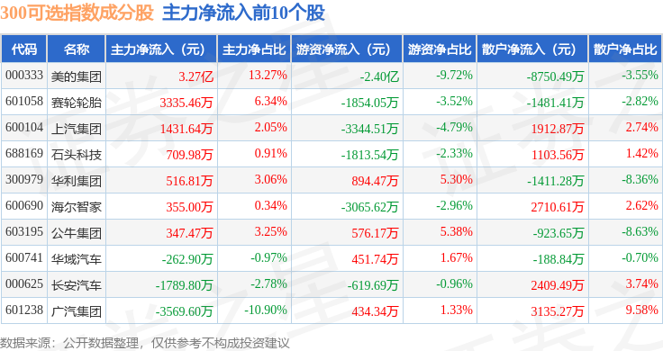 资金流向方面,300可选(000911)指数成份股当日主力资金净流出合计26.01亿元,游资资金净流入合计6.03亿元,散户资金净流入合计19.97亿元。成份股资金流向详情见下表: