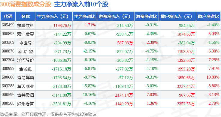 资金流向方面,300消费(000912)指数成份股当日主力资金净流出合计10.86亿元,游资资金净流入合计3.78亿元,散户资金净流入合计7.08亿元。成份股资金流向详情见下表: