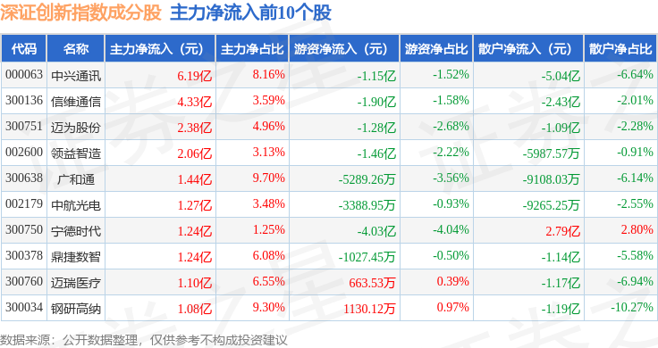 资金流向方面,深证创新(399016)指数成份股当日主力资金净流出合计104.13亿元,游资资金净流入合计52.13亿元,散户资金净流入合计52.01亿元。成份股资金流向详情见下表: