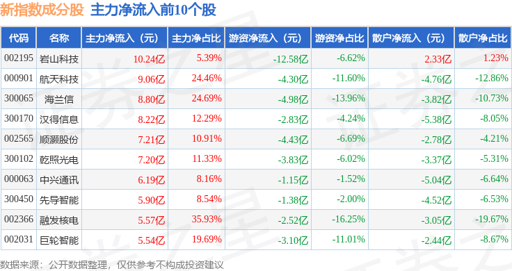 资金流向方面,新指数(399100)成份股当日主力资金净流出合计313.45亿元,游资资金净流入合计13.03亿元,散户资金净流入合计300.42亿元。成份股资金流向详情见下表: