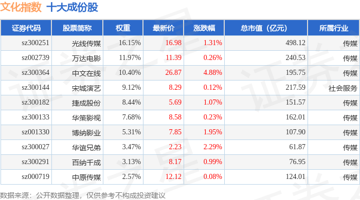 文化指数(399248)十大成份股详情如下: