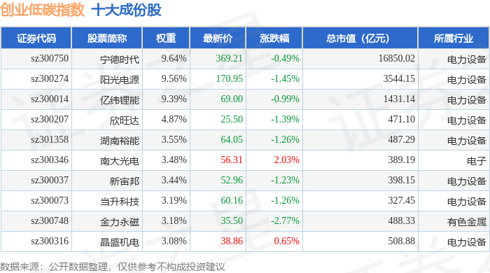 创业低碳(399259)指数十大成份股详情如下: