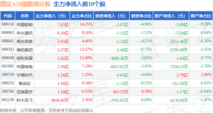 资金流向方面,国证A50(399310)指数成份股当日主力资金净流出合计130.39亿元,游资资金净流入合计59.71亿元,散户资金净流入合计70.67亿元。成份股资金流向详情见下表: