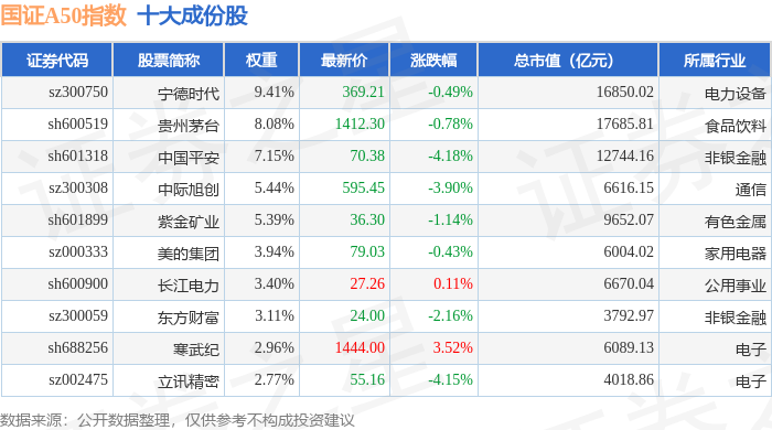 国证A50(399310)指数十大成份股详情如下: