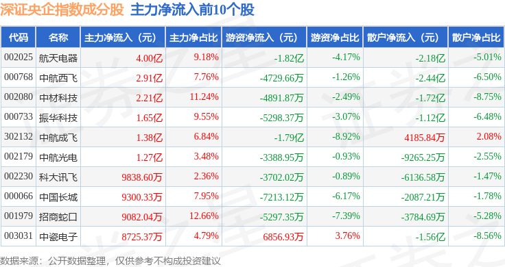 资金流向方面,深证央企(399335)指数成份股当日主力资金净流入合计6.8亿元,游资资金净流出合计4.87亿元,散户资金净流出合计1.93亿元。成份股资金流向详情见下表: