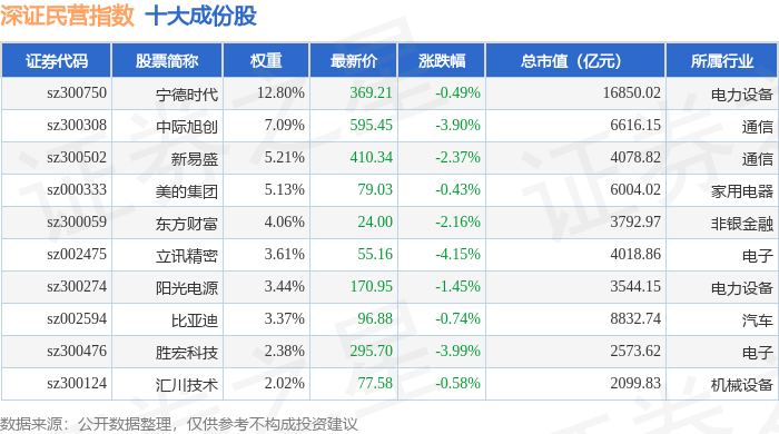 深证民营(399337)指数十大成份股详情如下: