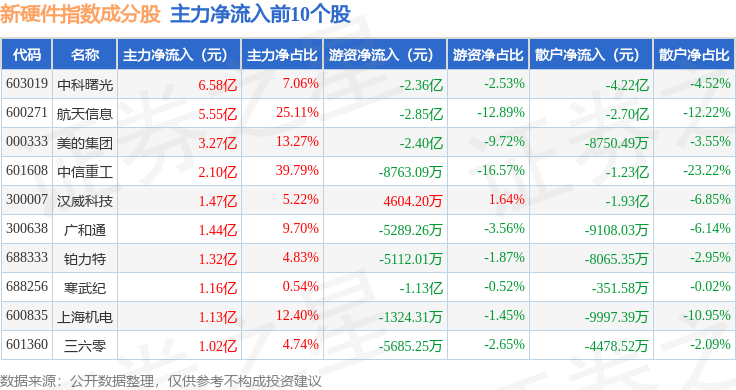 资金流向方面,新硬件(399360)指数成份股当日主力资金净流出合计38.08亿元,游资资金净流出合计8121.49万元,散户资金净流入合计38.89亿元。成份股资金流向详情见下表: