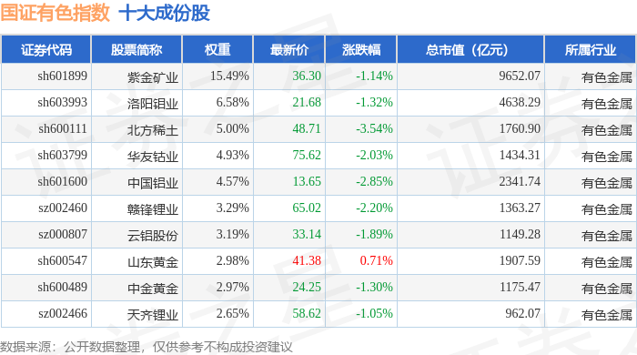 国证有色(399395)指数十大成份股详情如下: