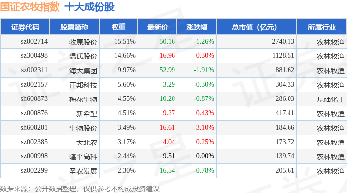 国证农牧(399435)指数十大成份股详情如下: