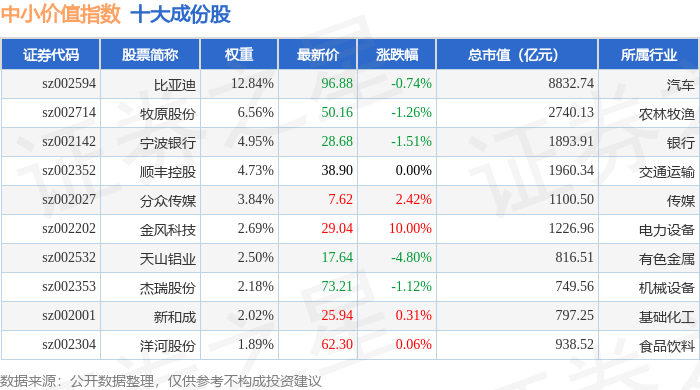 证券之星消息,1月8日,中小价值(399604)指数报收于2098.25点,涨0.11%,成交611.5亿元,换手率1.42%。当日该指数成份股中,上涨的有51家,金风科技以10.0%的涨幅领涨,下跌的有44家,天山铝业以4.8%的跌幅领跌。
