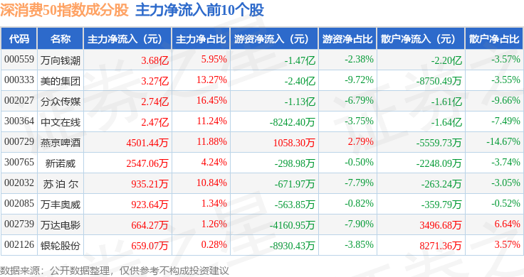 资金流向方面,深消费50(399646)指数成份股当日主力资金净流出合计25.77亿元,游资资金净流入合计4.82亿元,散户资金净流入合计20.95亿元。成份股资金流向详情见下表: