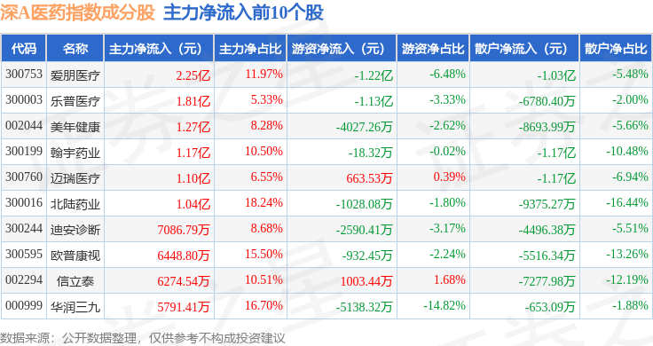 资金流向方面,深A医药(399674)指数成份股当日主力资金净流入合计1.2亿元,游资资金净流出合计2645.42万元,散户资金净流出合计9358.31万元。成份股资金流向详情见下表: