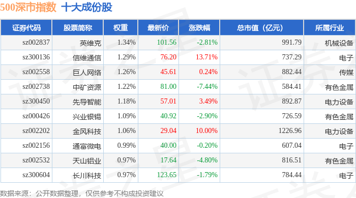 500深市(399802)指数十大成份股详情如下: