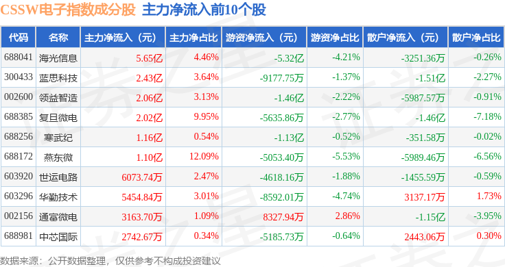 资金流向方面,CSSW电子(399811)指数成份股当日主力资金净流出合计117.41亿元,游资资金净流入合计34.37亿元,散户资金净流入合计83.04亿元。成份股资金流向详情见下表: