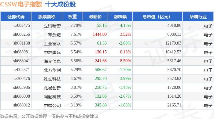 证券之星消息,1月8日,CSSW电子(399811)指数报收于6071.51点,跌0.77%,成交1987.48亿元,换手率3.11%。当日该指数成份股中,上涨的有18家,海光信息以8.5%的涨幅领涨,下跌的有41家,拓荆科技以5.33%的跌幅领跌。