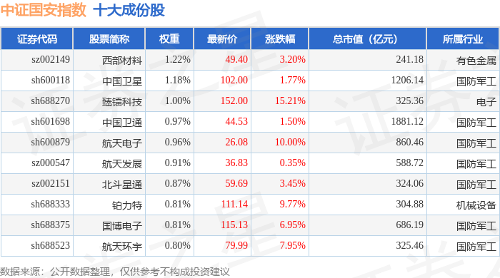 中证国安(399813)指数十大成份股详情如下: