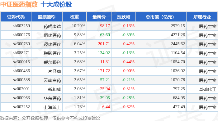 中证医药(399933)指数十大成份股详情如下: