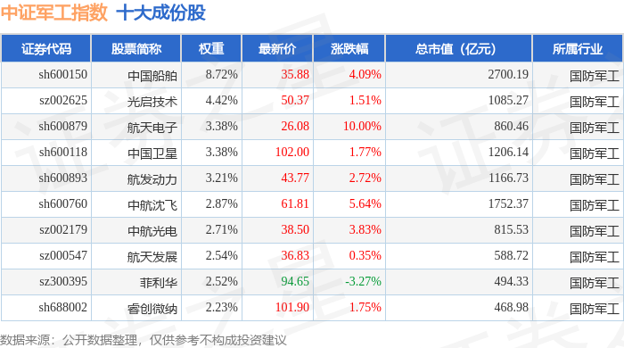 中证军工(399967)指数十大成份股详情如下: