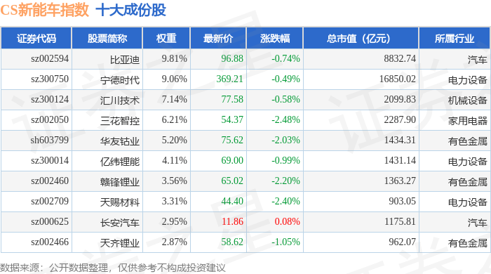 资金流向方面,CS新能车(399976)指数成份股当日主力资金净流出合计79.41亿元,游资资金净流入合计14.96亿元,散户资金净流入合计63.82亿元。成份股资金流向详情见下表: