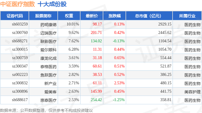 证券之星消息,1月8日,中证医疗(399989)指数报收于7294.22点,涨0.92%,成交335.93亿元,换手率2.93%。当日该指数成份股中,上涨的有42家,乐普医疗以5.99%的涨幅领涨,下跌的有8家,惠泰医疗以1.25%的跌幅领跌。