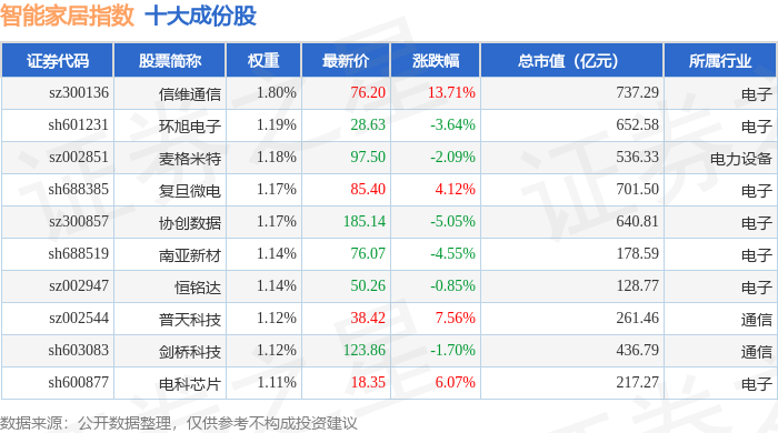 智能家居(399996)指数十大成份股详情如下: