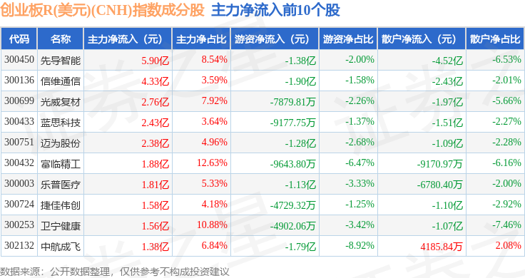 资金流向方面,创业板R(美元)(CNH)(470007)指数成份股当日主力资金净流出合计138.47亿元,游资资金净流入合计71.41亿元,散户资金净流入合计67.06亿元。成份股资金流向详情见下表: