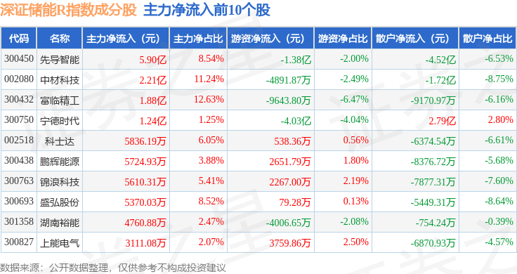 资金流向方面,深证储能R(470036)指数成份股当日主力资金净流出合计59.3亿元,游资资金净流入合计11.43亿元,散户资金净流入合计47.87亿元。成份股资金流向详情见下表: