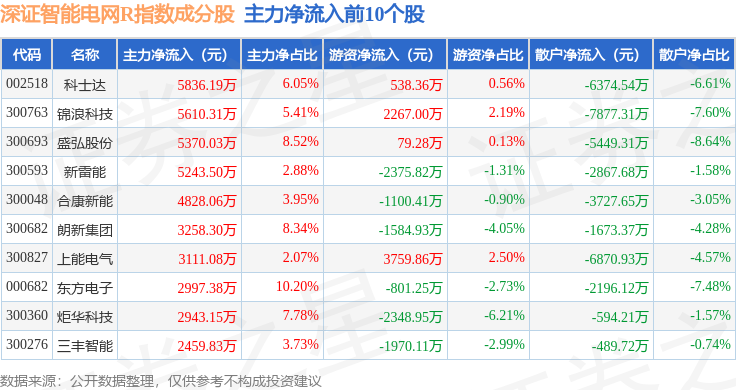 资金流向方面,深证智能电网R(470054)指数成份股当日主力资金净流出合计4.69亿元,游资资金净流入合计3546.56万元,散户资金净流入合计4.33亿元。成份股资金流向详情见下表: