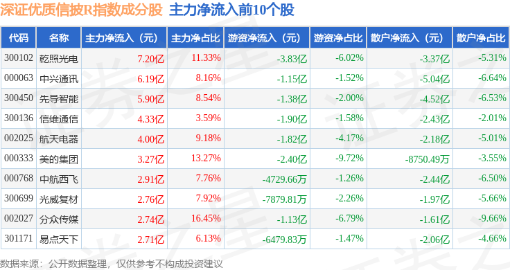 资金流向方面,深证优质信披R(470065)指数成份股当日主力资金净流出合计190.94亿元,游资资金净流入合计78.74亿元,散户资金净流入合计112.2亿元。成份股资金流向详情见下表: