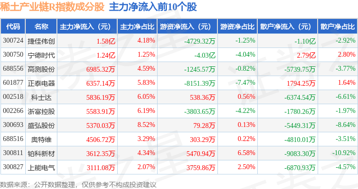 资金流向方面,稀土产业链R(489013)指数成份股当日主力资金净流出合计49.37亿元,游资资金净流入合计14.9亿元,散户资金净流入合计34.47亿元。成份股资金流向详情见下表: