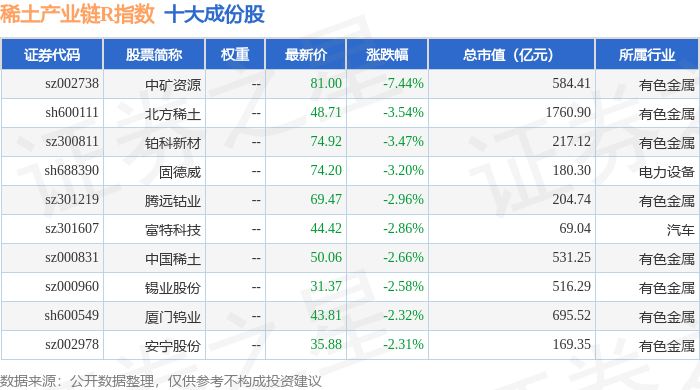 稀土产业链R(489013)指数十大成份股详情如下: