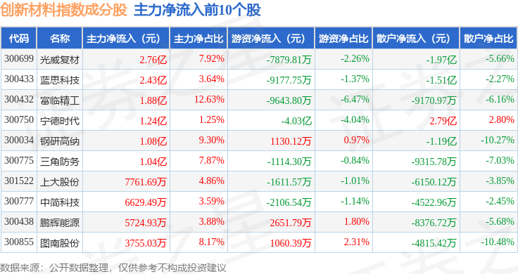 资金流向方面,创新材料(970039)指数成份股当日主力资金净流出合计23.93亿元,游资资金净流入合计4996.32万元,散户资金净流入合计23.43亿元。成份股资金流向详情见下表: