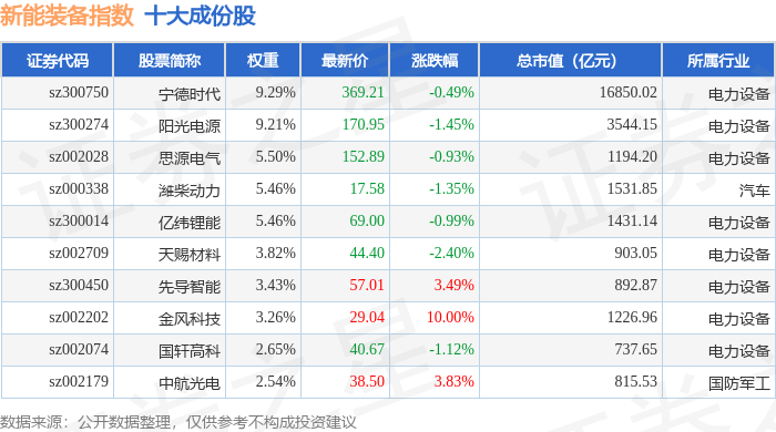 新能装备(970043)指数十大成份股详情如下: