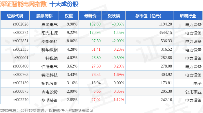 深证智能电网(970054)指数十大成份股详情如下: